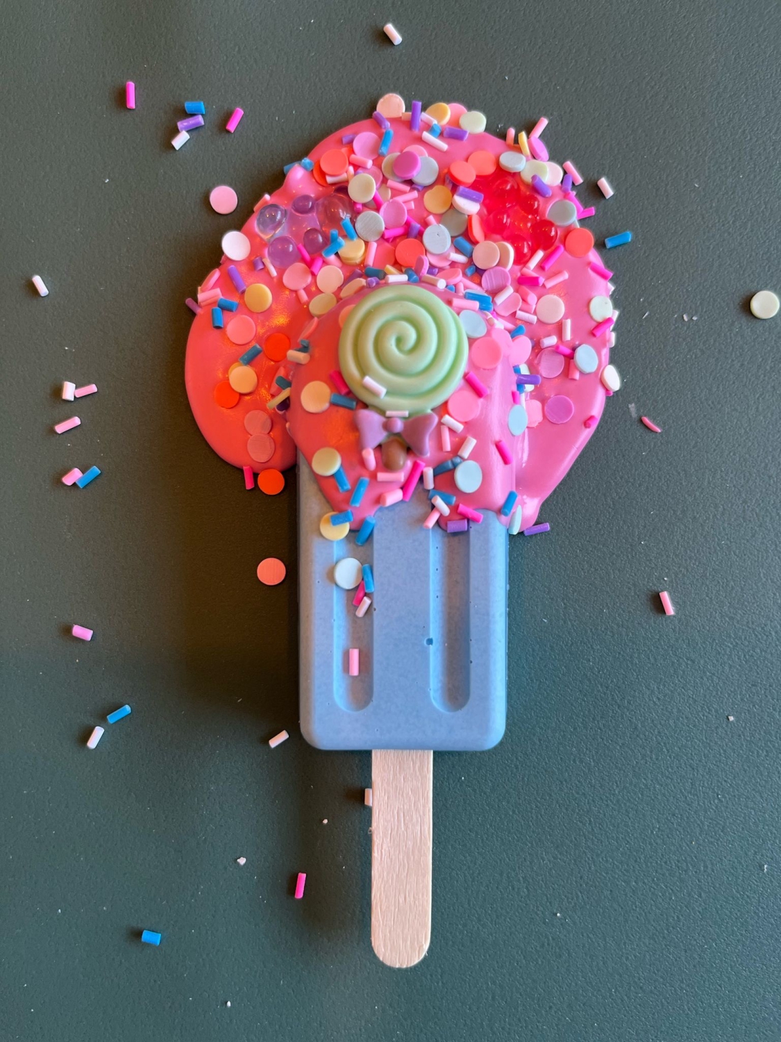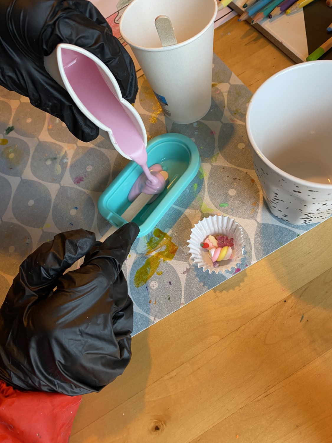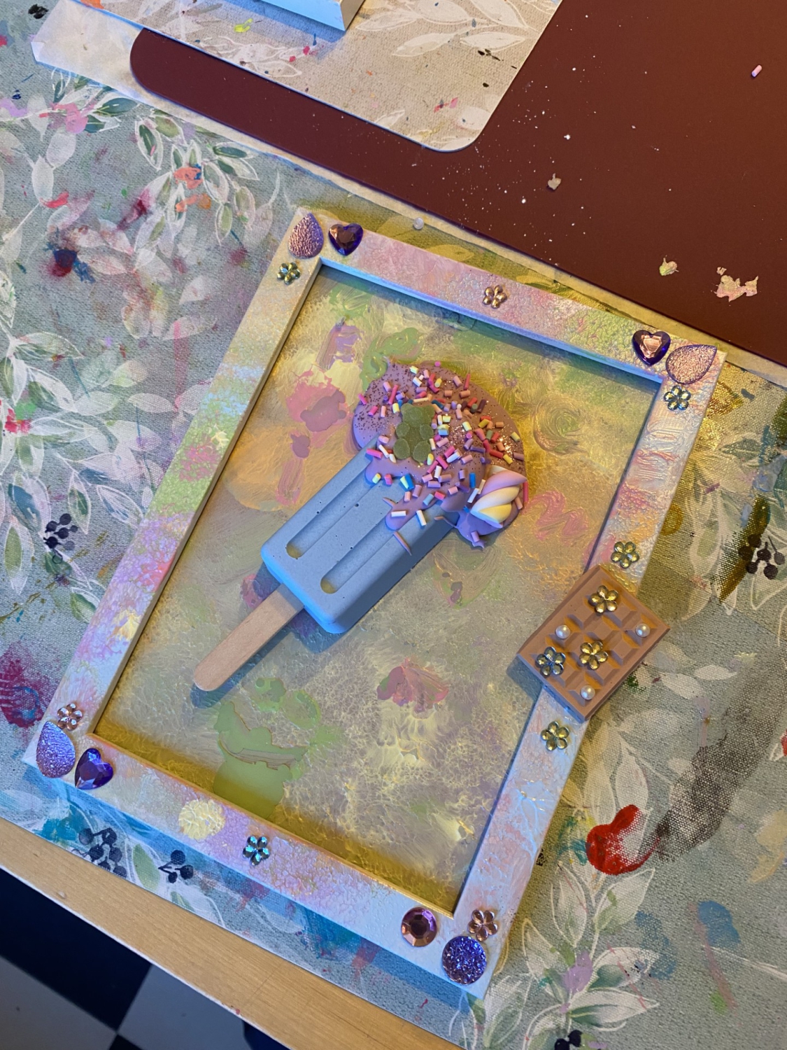 Omdat de ijsjes en de drip tijd nodig hebben om goed uit te harden, gaan we in de tussentijd met kwasten en verf aan de slag. Je beschilderd een fotolijstje waar we jouw ijsje opplakken zodat je je eigen ijs-kunstwerk thuis op kunt hangen!