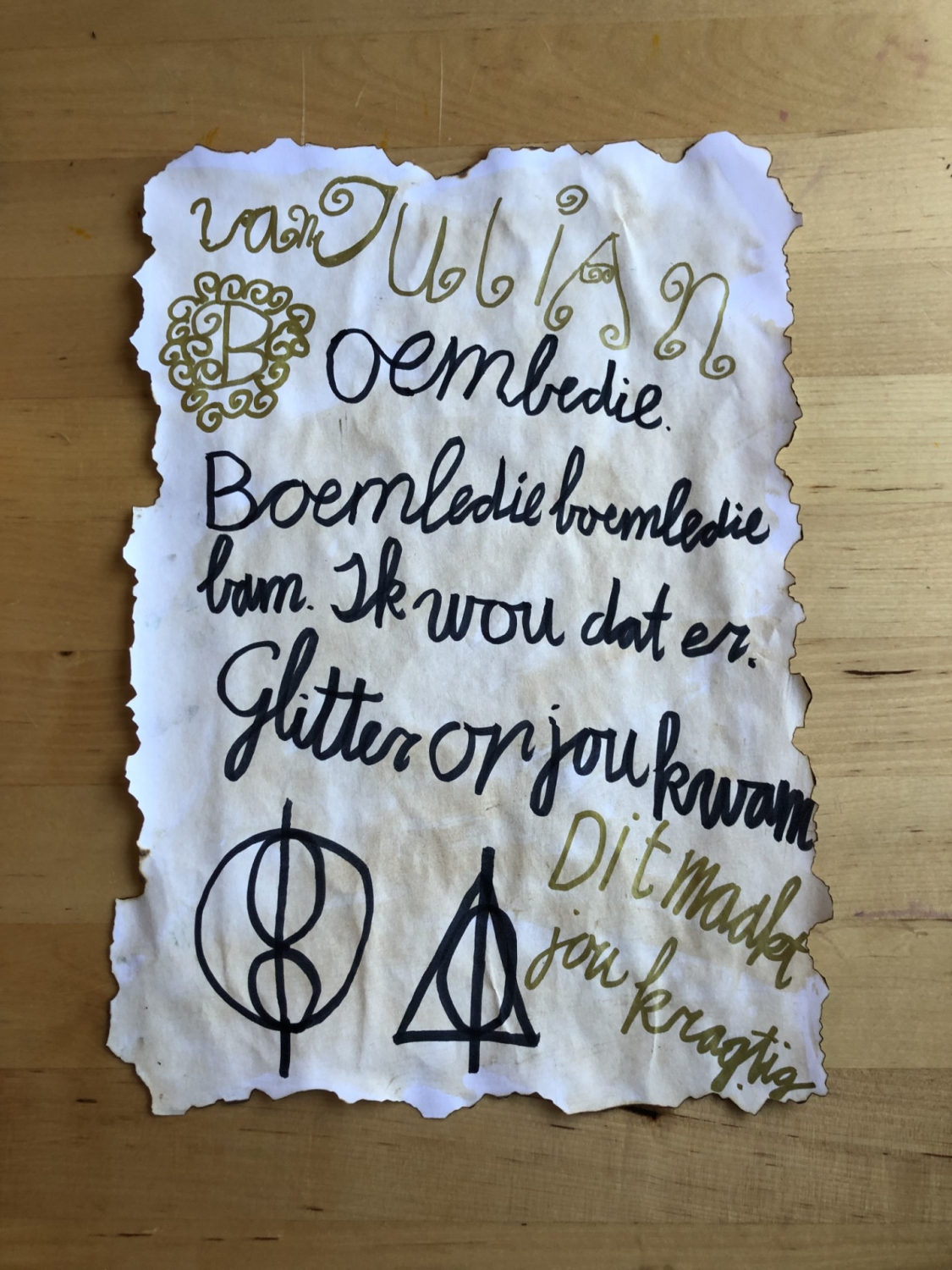 Het atelier wordt omgetoverd tot Zweinstein! En om te kunnen toveren gaan we onze eigen toverstok maken. We zetten ons magische brein aan het werk en bedenken de leukste, gekste of misschien wel slimste spreuk die we op een oud stuk perkament schrijven.